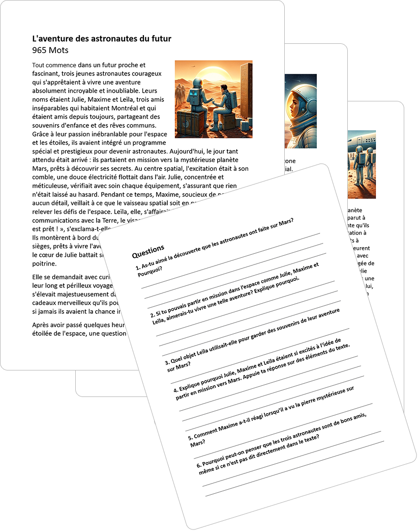 Vos enseignant recevront par courriel, sous format .docx (Word), une nouvelle lecture chaque semaine! Ils n'ont qu'à imprimer le document ou le partager en format numérique à leurs élèves. Ils ont également le corrigé des questions pour accélérer leur travail. Aucune connexion à la plateforme ou de licence numérique nécessaire.